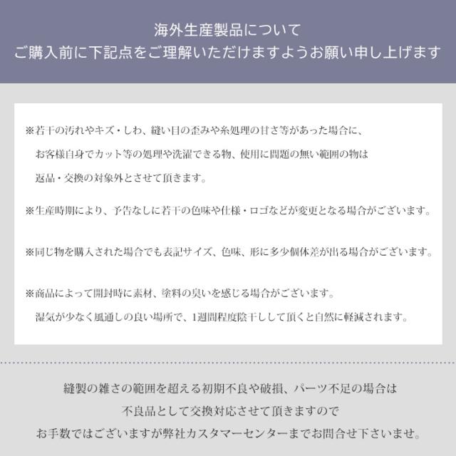 ■注意事項1:商品の開封時に素材の臭いを感じる場合がございます。湿気が少なく風通しの良い場所で、一週間程度陰干しして頂くと自然に軽減されます。