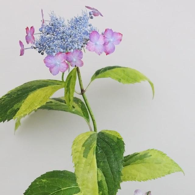 「瀬戸の虹」は新芽が白の掃込斑から萌黄色の掃込斑に変化する珍しい美葉品種のアジサイです。独特の花色も楽しめます。