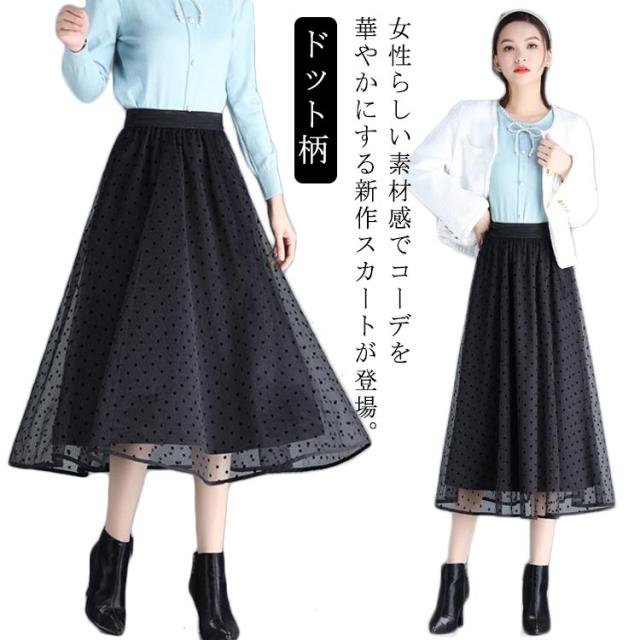 50代 スカート ドット柄 ロングスカート 体型カバー ミモレ丈 膝下丈 30代 ギャザー入り フレアスカート レディース 水玉柄 40代 スカート ゆったり 春 ハイエース ゴムウエスト チュールスカート 夏 秋 aラインスカート