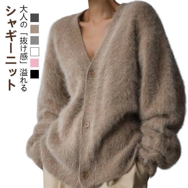 ニットカーディガン 秋 ニット レディース シャギー Vネック シャギーカーディガン 冬 カーディガン トップス シャギーニット ゆったり ニットカーディガン 大きいサイズ ボタン ドロップショルダー 羽織り 毛足長い 暖かい もこもこ 無地