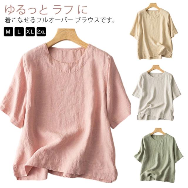 ブラウス シャツ 半袖 レディース 綿麻風シャツ クルーネック ラウンドネック 夏 レディース tシャツ 女性 50代 Uネック ブラウス スリット ゆったり 秋 30代 40代 春 50代 60代 ブラウス カジュアル 大人 ナチュラル 送料無料 ルームウエア