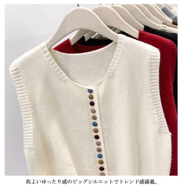 ニットベスト ノースリーブ カラフルボタン クルーネック レイヤード 春 ニット 冬 ベスト トップス 秋 セーター カラフルボタン 重ね着 大きいサイズ ゆったり カジュアル 大人可愛い