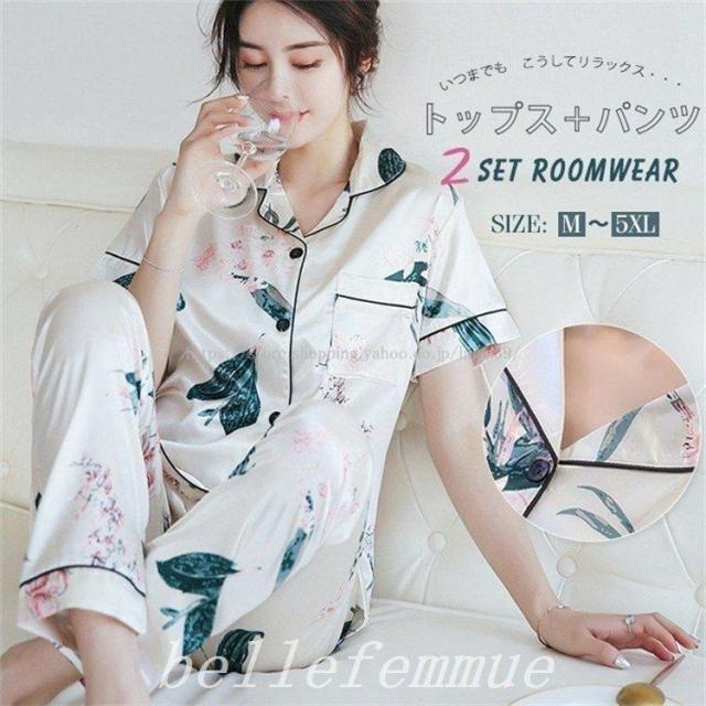パジャマレディース前開き半袖長ズボンサテン光沢花柄大きいサイズ薄手ルームウェア