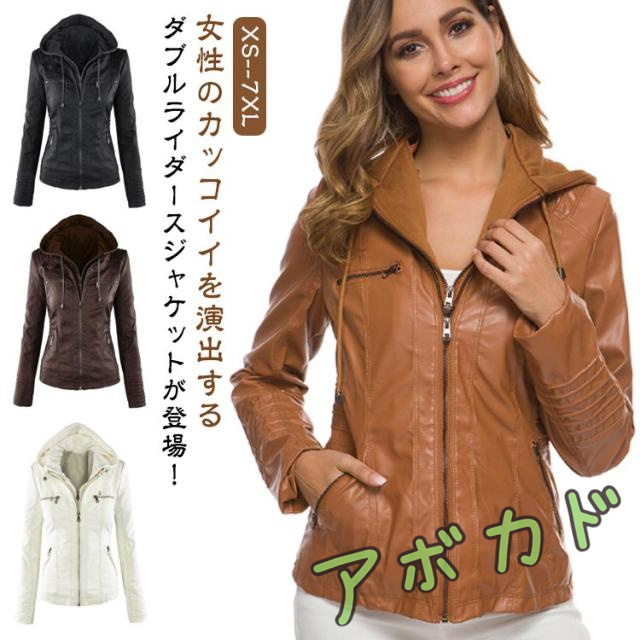 フード付き レディース フェイクレザー ショート丈 ジャケット ライダースジャケット アウター ライダース PUレザー 秋服 合皮ジャケット ダブルジップ ゆったり お洒落 大きいサイズ 着痩せ 春服 フード付き 秋アウター カジュアル 大きサイズ