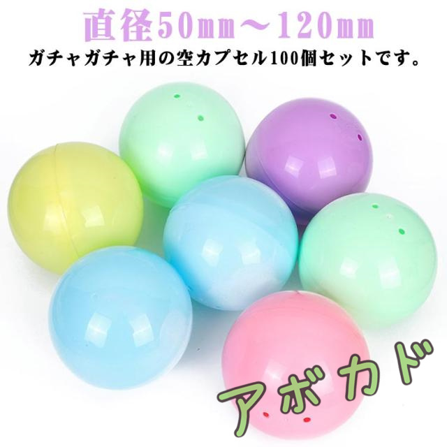 | 直径50mm?120mm ガチャガチャ用の空カプセル100個セットです。 ガチャガチャでのご利用はもちろん、クレーンゲームやディスプレイにも。 誤飲防止のために、空気穴が空いています | |