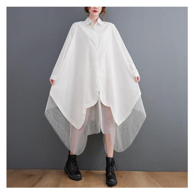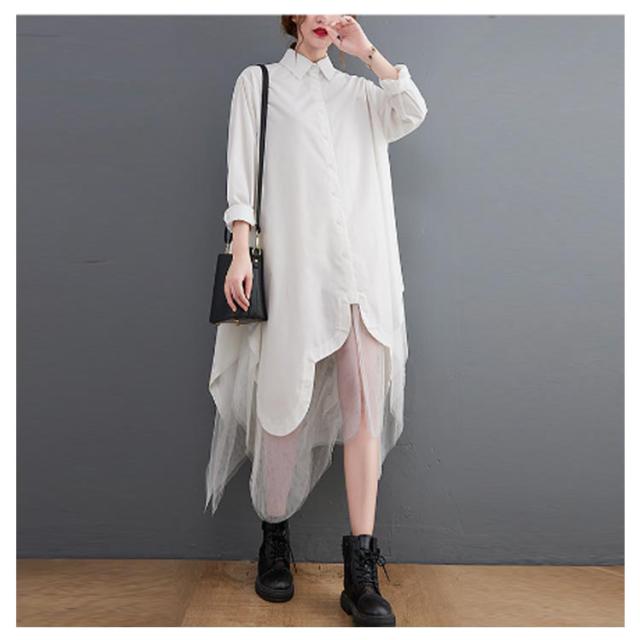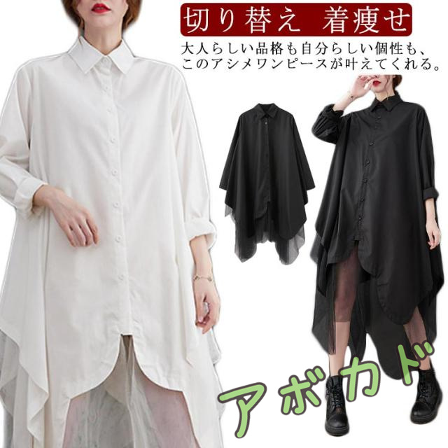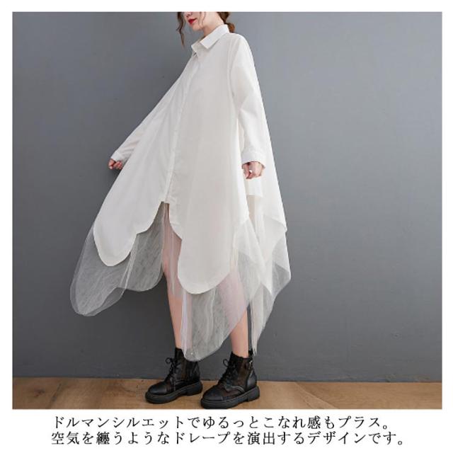 チュール ワンピース ロングシャツ ドルマン 結婚式ワンピース 切り替え シースルー フレア シャツワンピース レイヤード風 アシンメトリー パーティードレス アシンメトリー 異素材 シアー オケージョン 着痩せ フィッシュテール モード系