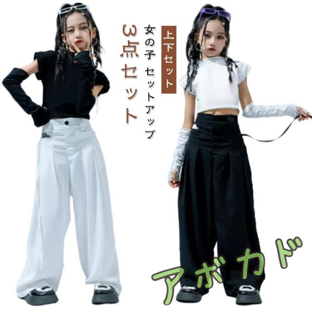 パンツ 3点セット かっこいい 女の子 上下セット ダンス衣装 トップス ゆったり ジャズダンス 白 黒 キッズ ホワイト 腕カバー セットアップ ヒップホップ 派手 韓国 kpop ダンス衣装 練習着 応援団 演出服 団体服 発表会 小学生ダンス ダンス教室
