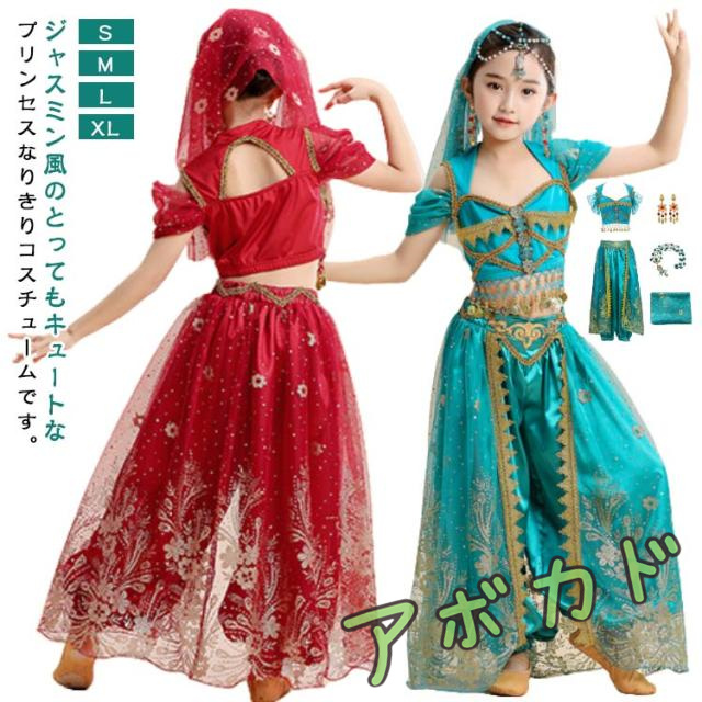 プリンセス ジャスミン衣装 ドレス キッズ 仮装 アラビアン お姫様 ハロウィン 100 豪華4点セット プリンセス なりきり こども ステージ衣装 パーティードレス コスチューム 90 ダンス衣装 110 120 130 140 150cm ブルー レッド クリスマス 誕生日