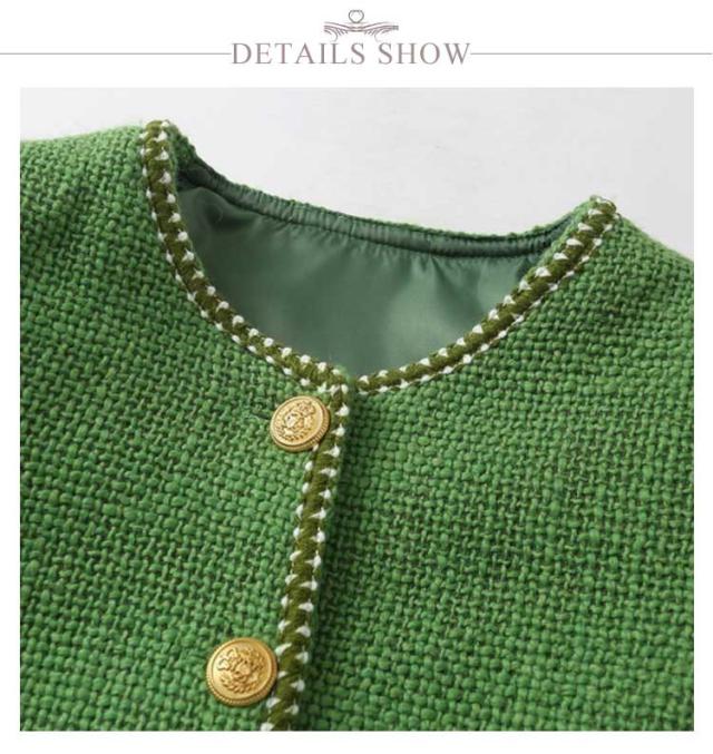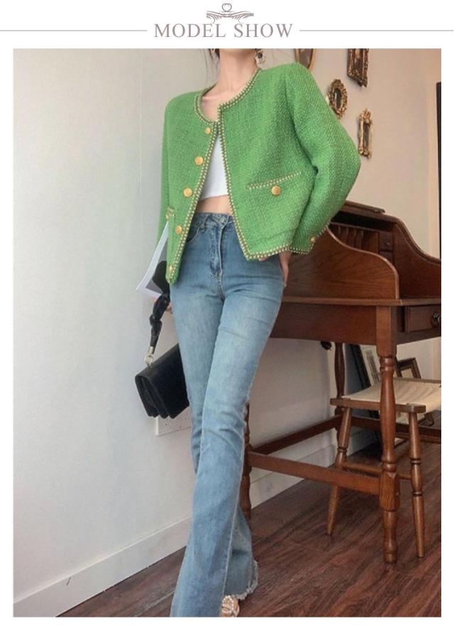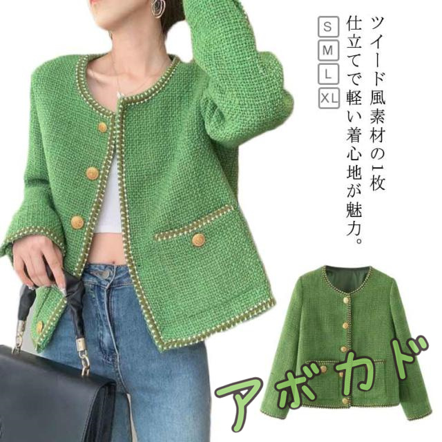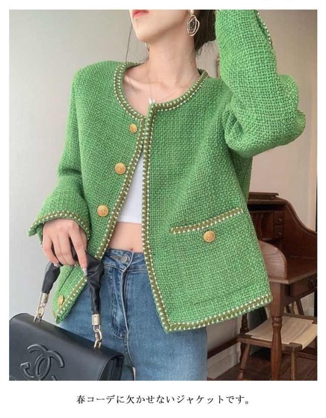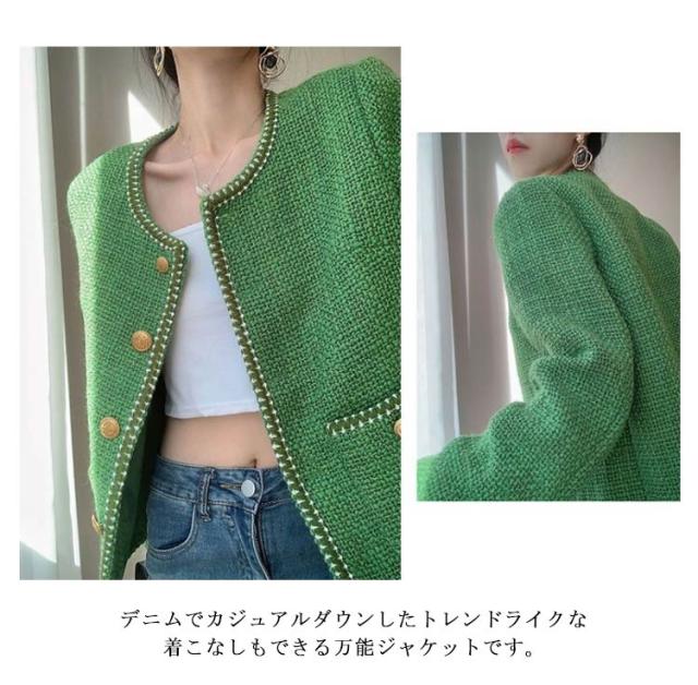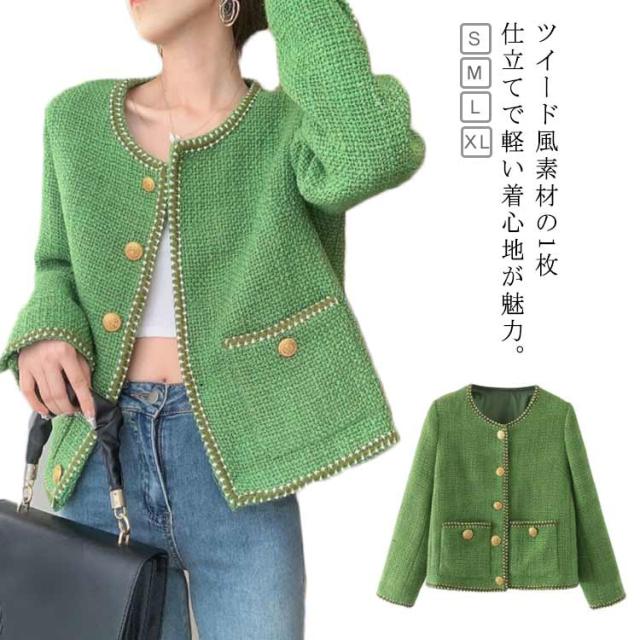 送料無料 ジャケット レディース ツイードジャケット アウター 羽織り カーディガン ライトアウター ノーカラー オフィスカジュアル 上品 入学式 スーツ 母 セレモニー 通勤OL オフィス 結婚式 入学式 卒業式 大人 韓国風 春 夏 秋 グリーン