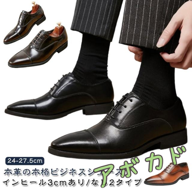 | 24-27.5cm インヒール3cmあり/なし2タイプ 本革の本格ビジネスシューズ ビジネスシーンにも冠婚葬祭にも対応してくれる万能デザイン。どんなシーンにも使えるので、1足持っていると安心です。 ・アッパーにはやわらかな牛革を採用し、足をやさしく包み込みます。 ・靴底は合成底を採用しているので、雨の日も滑りにくいです。 ・ミッドソールには、軽量でクッション性と屈曲性のあるマイクロファイバー素材。 ・アウターソールには屈曲溝を多めに設けて、歩行性を向上しています。 ・ラウンドトゥのデザインは、さまざまなスタイルに合わせやすく馴染みやすい一足。 | |