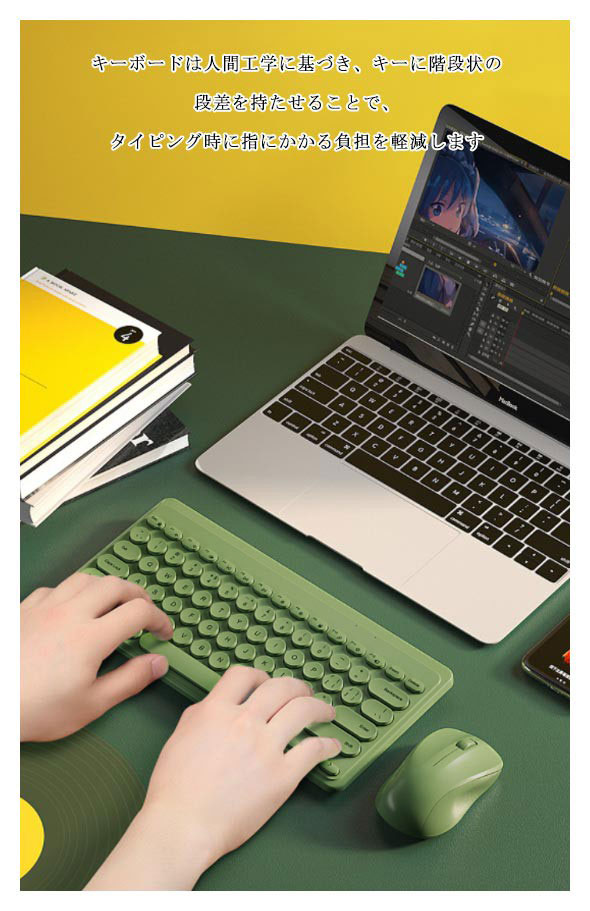 | レトロで可愛いキーボード&気にならない静音設計されマウスセット。 信頼性の高い接続&1のレシーバーを共用。 超薄型デザイン&快適に入力できる。 キーボードとマウスに電池を入れて、パソコンのUSBポートにレシーバーを挿し込むだけで使用可能。 | |
