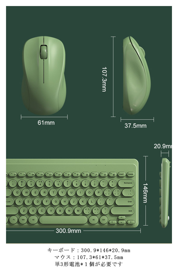 | サイズについての説明 | マウス・キーボードは一つの受信機を共用する。 キーボード:300.9*146*20.9mm マウス:107.3*61*37.5mm 単3形電池*1個が必要です。 ※電池が付属しませんので、別途にて購入お願い致します。 |