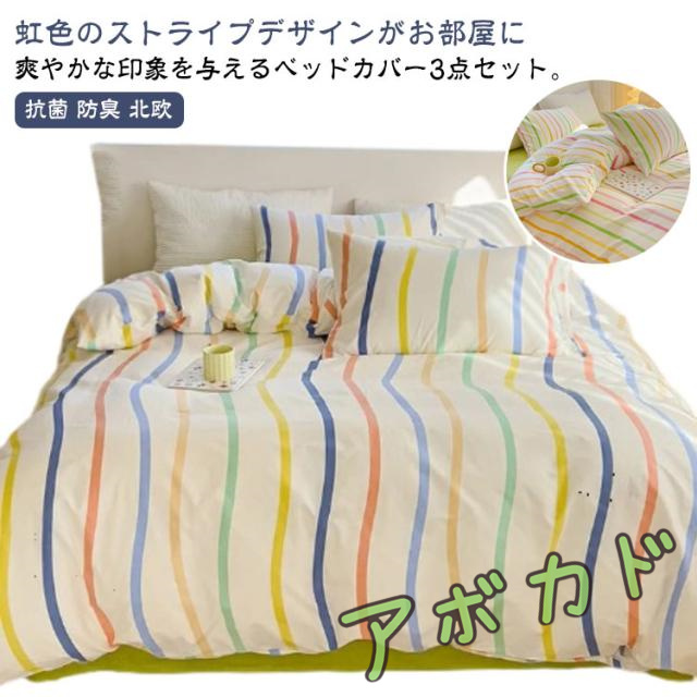 | 虹色のストライプデザインがお部屋に爽やかな印象を与えるベッドカバー3点セット。 綿100%なので季節を問わずオールシーズン使用できます 布団カバーは着脱しやすいファスナーで、内側には紐止めが付いており、布団のずれを防ぎます。 枕カバーはファスナーなしで出し入れ簡単!! 上品なストライプがお部屋を一段とおしゃれにしてくれます。 | |