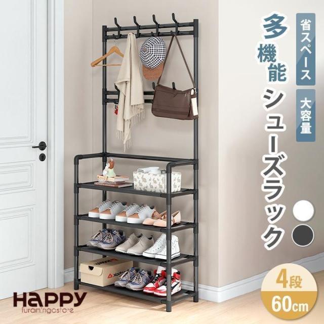 フック付き シューズラック 4段 60cm ハンガー ラック 玄関 靴 棚 帽子 カギ 収納 スリム 大容量 小物置き 下駄箱 白 黒 組立式 工具不要 省スペース