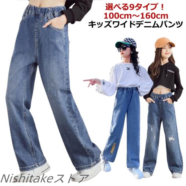 【選べる9タイプ】 デニム ワイドパンツ キッズ 女の子 デニムパンツ ジュニア ボトムス ロングパンツ 子供服 110 120 130 140 150 160cm 長ズボン ダメージ ストレート ジーパン ジーンズ 男の子 子供 子ども服 ユニセックス ブルー ブラック 韓国子供服
