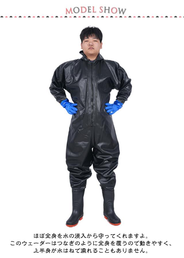 | 【全身防水】【フード付き】 ・首元まで防水してくれるウェーディング用スーツです。 ・ほぼ全身を水の浸入から守ってくれますよ。 ・このウェーダーはつなぎのように全身を覆うので動きやすく、上半身が水はねで濡れることもありません。 ・フード付きで全身をすっぽり覆ってくれる防水着なので、雨天の作業でも雨風からあなたの体をしっかりガード。 ・レインコートのように豪雨ではだけることもないので、台風などの緊急時の救護作業でも威力を発揮します。 ・素材は厚手のPVCで傷つきにくく、水の侵入はもちろん外気からも肌をしっかり守ります。 ・胸ファスナーも水の侵入を防ぐ仕様で、さらにその下にも防水布を装備。 ・靴底も滑り止めの着いた弾力素材なので履き心地もGood。 ・全体を立体成型しているので動きやすさもバッチリです。 ・漁業や農業、工事現場など様々なシーンで活躍してくれる防水着です。 | |