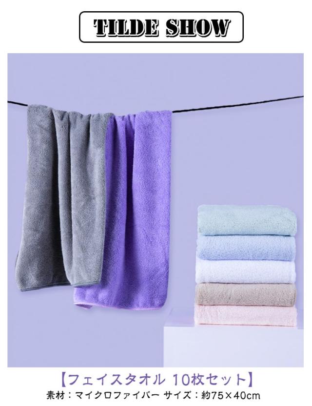 | マイクロファイバー吸水タオル。【10枚セット】 【フェイスタオル 10枚セット】素材:マイクロファイバー サイズ:約75×40cm 【肌触り柔らかい】高品質な素材から作られたバスタオル、倍以上ふわふわ柔らかな肌触を実現しました。しなやかで贅沢な触感、優しく包み込む。繊維の高い密度、程よい厚み、重み感じないなどと優れています。 【吸水性・速乾性に優れる】吸水性と速乾性に優れいてます!風呂上がりの時にそっと拭くだけで素早く水分を吸収し、水分をキャッチします。また通気性の特徴で時短に乾かすことも可能です。雨天の多い季節の中、部屋干しもおすすめしますよ!清潔を保しつつ、抗菌・防臭効果もあります、いつもさらりとした心地よさを実現できます! 【毛羽落ち・色落ちのご心配はいりません】強靭な糸と精緻な織法で、毛羽落ちや色褪せは心配無用。高密度のマイクロファイバーが毛羽を抑え、何度洗濯してもほつれませんしかの柔らかさが続く。実験室の測定により色移りや色褪せ現象はしないので長くそのままの美しい状態をキープします。 【超実用性で贈り物に最適】こんなにも機能性をもつタオルだから自宅、温泉、ジム、プールなど、あらゆる場面で大活躍します!。お風呂上がりはもちろん使えるし運動をした後も、旅行先も、ジムも、温泉も、赤ちゃんかお年寄りさんの介護もおすすめ! | |
