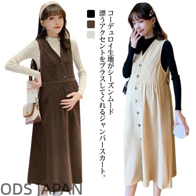ジャンパースカート マタニティ ジャンスカ コーデュロイ Vネック フロントボタン ノースリーブ ワンピース ロング 妊婦服 ゆったり 春 秋 冬 体型カバー タック入り 産前 産後 カジュアル おしゃれ