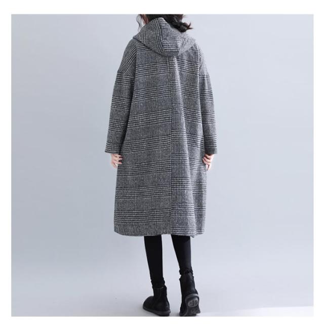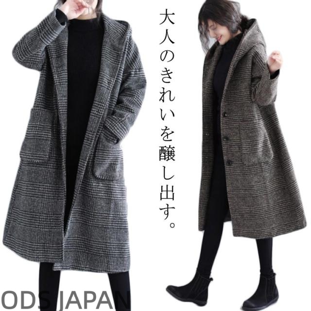 コート レディース アウター ロングコート フード ロング丈 ひざ丈 チェック チェック柄 長袖 カジュアル 千鳥格子 秋冬 春秋 防寒 30代 40代 50代 ミセスファッション きれいめ シンプル ゆったり