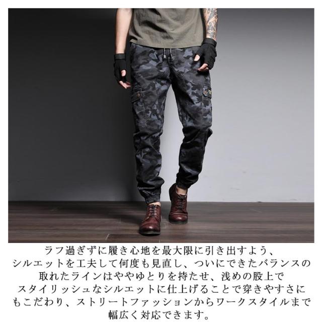 | スタイリッシュ迷彩柄カーゴパンツ。 デザインはワークならではのフロントポケットとバックのフラップポケットがポイント。 ポケットの数が豊富で収納力に優れている点はもちろん、シンプルな着こなしのアクセントとしても◎。 ラフ過ぎずに履き心地を最大限に引き出すよう、シルエットを工夫して何度も見直し、ついにできたバランスの取れたラインはややゆとりを持たせ、浅めの股上でスタイリッシュなシルエットに仕上げることで穿きやすさにもこだわり、ストリートファッションからワークスタイルまで幅広く対応できます。 裾のゴム部分もしっかり伸びます!!ジョガータイプなので足元がスッキリとスタイリッシュにきまります! ジャケットなどとの相性が良く、オンにもオフにも着こなせるテーパードパンツに仕上がっています。 | |