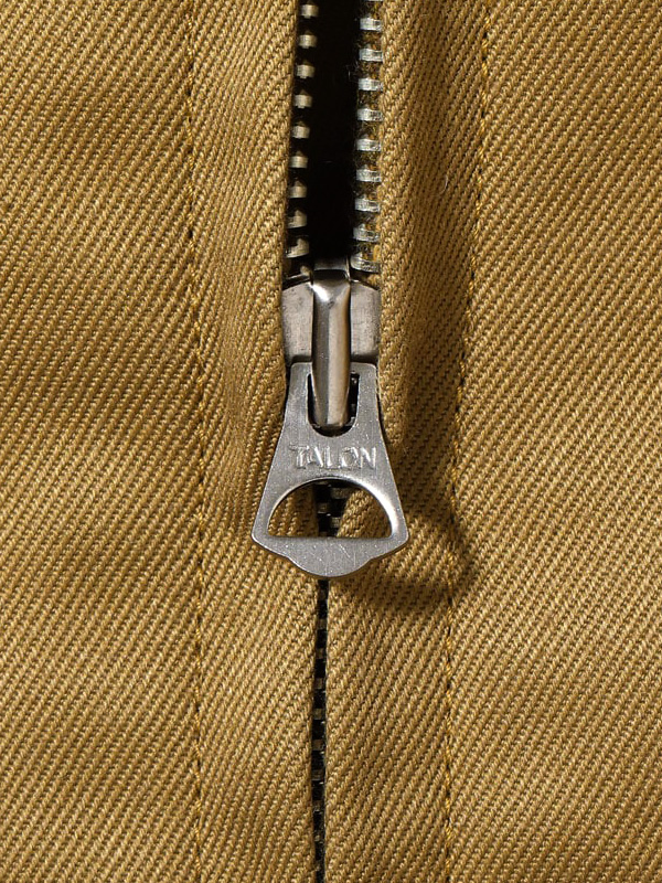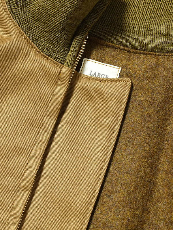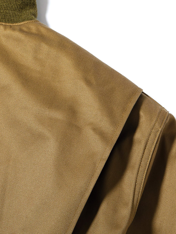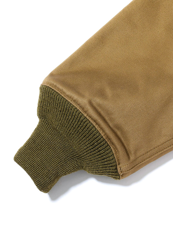 アウターシェルは耐水・耐風加工を施したコットンツイルで、ライナーは26oz.ウールを使用し、脇や袖などは2本針で巻縫いされている。