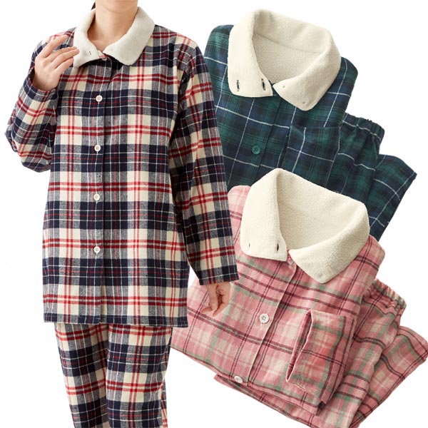 綿100%のビエラ素材を起毛させたシャツタイプのパジャマ。衿から肩にかけての肌側にはボア生地を使用し、冷えやすい肩口も暖か。就寝時には衿のボタンを閉めて寒さをシャットアウトできます。パンツの裾はお布団の中で動いてもめくれ上がらないように別布ゴム入りの仕様になっており、保温性もアップ。パンツのウエストは総ゴム仕様でゴムの長さを調節できる取替え口付きです。カラーはピンク系、グリーン系、ネイビー系の3色展開です。
