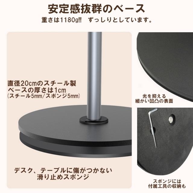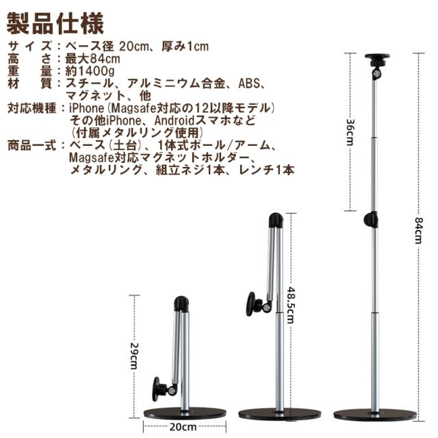 サ イ ズ:ベース径 200mm 厚み10mm 高 さ:最大840mm 重 量:約1400g 材 質:スチール、アルミニウム合金、ABS、マグネット、他 商品一式:ベース(土台)、1体式のポール/アーム、メタルリング、 Magsafe対応マグネットホルダー、 組立ネジ1本、レンチ1本 対応機種:iPhone Magsafe対応の12以降モデル(直接使用可能) Androidスマホなど(付属メタルリング使用時) 保証期間:初期不良保証(お届け後1週間) ※注 意※ ●スマートフォンの重量や位置によってはバランスが悪くなり倒れやすくなる場合がございます ●海外製造商品のため輸送時の小傷や汚れ等ある場合がございます。予めご了承ください ●重量のある素材を使用していますので配送時の揺れ・衝撃などで箱潰れ等が起きやすくなっております 製品本体の不良・破損に起因しない箱潰れは免責とさせていただきます。予めご了承ください ●仕様やデザイン、パッケージ等は予告なく変更される場合がございます |