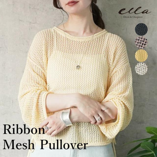 メッシュニット トップス カジュアル レディース プルオーバー 夏 春 女性 可愛い リボン シャーリング 着回し ゆったり 体型カバー 快適 デイリー コーデ 大人 上品 シンプル ラフ きれいめ 二の腕カバー 長袖 透け感 レイヤード 抜け感 ポリエステル