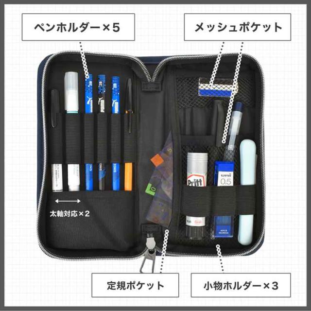 中にはホルダーやポケットを多数備え、散らかりやすい文房具をすっきりと持ち運べます。