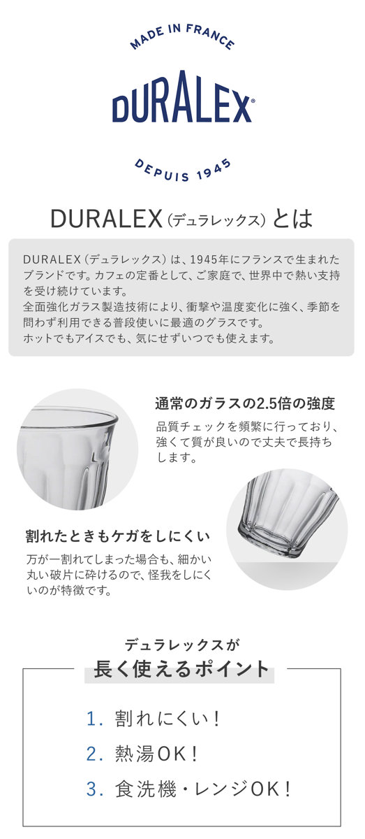 | 注意事項 | ※商品ページ内には同シリーズの別の商品を含む画像を使用しています DURALEX製品は、製造上、気泡やすり傷、しわ模様、飲み口の凹凸、底面の線、軽いぐらつきなどが見られる場合があります。 これらは製品の特性で、ご使用には問題ありません。 そのため、不良品ではなく返品・交換の対象外となります。 あらかじめご了承のうえ、ご購入をお願いいたします。 |