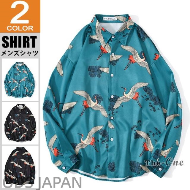 カジュアルシャツ メンズ 秋服 トップス 総柄シャツ 長袖 鶴柄 プリント 総柄 ゆったり デザインシャツ 春 秋