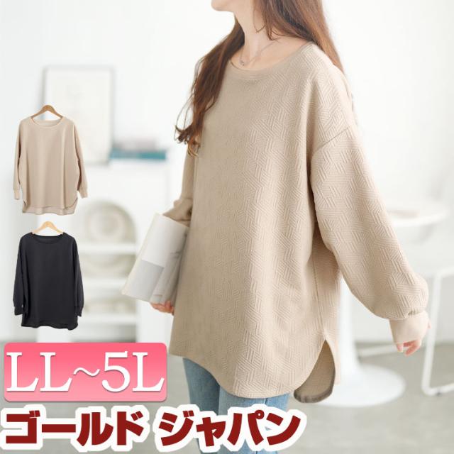 冬新作 大きいサイズ レディース チュニック 幾何学柄カットキルトボートネックチュニック 長袖 ロング 幾何学柄 ボートネック カットキルト テールカット ストレッチ ドロップショルダー ゆったり 秋服 冬服 春服 LL 2L 3L 4L 5L ベージュ ブラック 黒 ゴールドジャパン