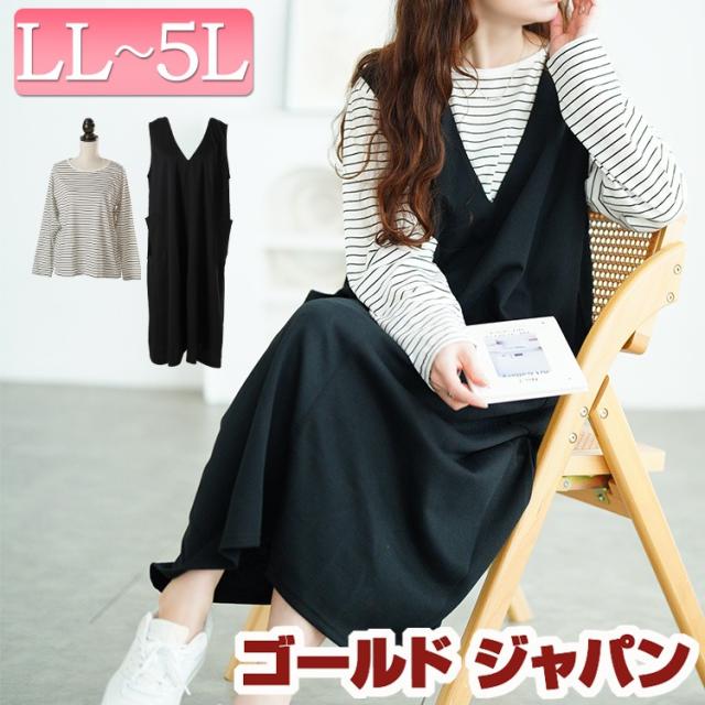 春新作 大きいサイズ レディース ワンピース ジャンパースカート&ボーダーロンT2点セット ワンピ ロングワンピース ジャンパースカート ジャンスカ セット ロンT ボーダー 長袖 ポケット ロング ストレッチ ゆったり 秋服 春 LL 2L 3L 4L 5L ブラック 黒 ゴールドジャパン
