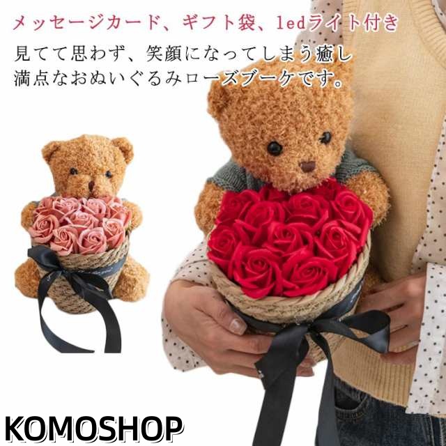 | 見てて思わず、笑顔になってしまう癒し満点なおぬいぐるみローズブーケです。【メッセージカード、ギフト袋、ledライト付き】 石?で作られているお花です。 石けんのいい匂いがふんわりと香るので人気があります。大切な人へのプレゼントへぴったり! 生花のように水やりやお手入れの必要がなく、枯れる心配も虫や花粉の心配もありません。 ふわふわの愛らしいベアがどんな素敵なシーンも可愛く華やかに彩ります 大事な記念日にプレゼントとしてそのままお渡しすることも可能です。玄関やお部屋にそのまま飾って頂くだけで、ほのかな香りが楽しめるインテリアや飾りになるおしゃれな芳香剤として女性にも男性にも喜ばれるフラワーギフトです。 母の日、バレンタイン、入学式、卒業式、退職祝い、結婚式、誕生日、記念日など、ちょっとしたプレゼントにぴったりです。 【手提げ袋付き】おしゃれな手提げ袋付きです。袋に入れると送った相手も持ち運びに便利です。 | |