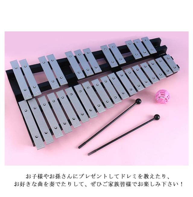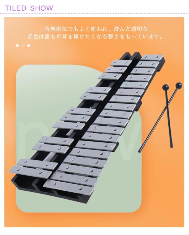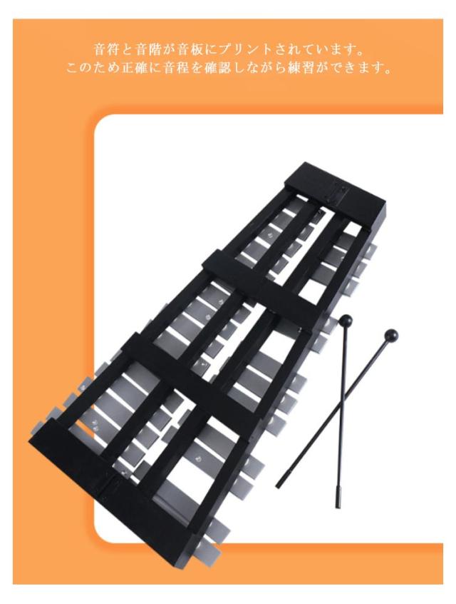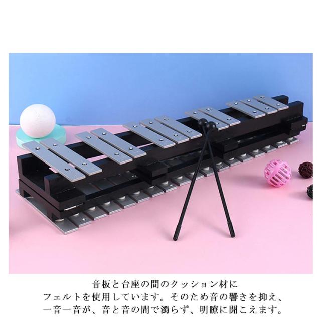 | 活動や発表会などで使用できる折畳み可能な鉄琴。 音楽療法でもよく使われ、澄んだ透明な音色は誰もが耳を傾けたくなる響きをもっています。 音符と音階が音板にプリントされています。このため正確に音程を確認しながら練習ができます。 音板と台座の間のクッション材にフェルトを使用しています。そのため音の響きを抑え、一音一音が、音と音の間で濁らず、明瞭に聞こえます。 お子様やお孫さんにプレゼントしてドレミを教えたり、お好きな曲を奏でたりして、ぜひご家族皆様でお楽しみ下さい! | |