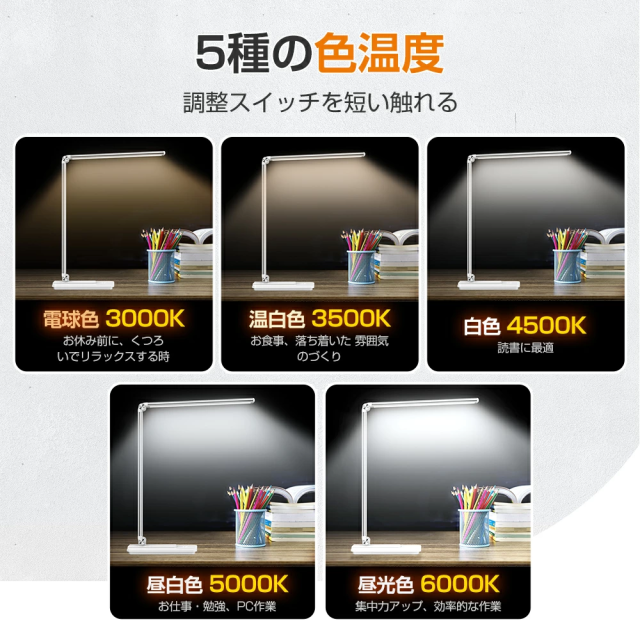【超高輝度・調色5段階・無段階調光・タッチセンサー】 Lettop デスクライト は電球色、温白色、白色、昼白色、昼光色など5種の色温度調節、明るさ調整が無段階調光の親切設計な電気スタンドとなり、卓上 ライトの色温度調整は調節スイッチ1つで、明るさ調整は電源スイッチを長押しで調整できる操作簡単な スタンドライト ledです。最大ルーメンは600まで至り、他の製品と比べ、より明るく卓上照明でき、長時間の集中にサポートできるデスクライトです。さらに、タッチセンサー式で指で優しく触れるだけで簡単にオン・オフが調節でき、年寄りから子供まで使用しやすいです。企画:日本、製造:中国
