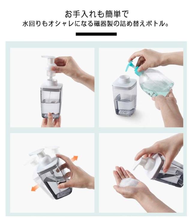 | ハンドソープなどの市販ボトルから、ディスペンサーに詰め替えるだけ! キッチンやバスルームがホテルのようなかっこいい空間に変身するインテリア小物です。 人気の北欧風や韓国インテリア、シャビーシックやモロッカン、バリ風などのアジアンリゾート系などさまざまなテイストのお部屋に似合います。 片手でプッシュしてそのまま手のひらで液体ソープを受け止められるので簡単に手洗いできます。 泡たてタイプも用意しています! ボディーシャンプー、手洗い用のリキッド石鹸など、さまざまな液状洗剤にご利用いただけます。 台所ならリキッドソープと食器用洗剤、洗面所では薬用せっけんを個人ごとに色別にして使い分けも可能です。 お手入れも簡単で水回りもオシャレになる磁器製の詰め替えボトル。 適度な重みもありしっかりとした安定感。 北欧風の空間の演出に、ディスペンサーひとつで、上質な洗面スペースを造れます。 大学生や社会人の新生活や単身赴任のワンルームなど1人暮らしにもおすすめなシャンプーボトル。 詰替えるだけでオシャレなおうち時間をすごせそうです。 ご親戚やお友達の結婚祝い、新築祝い、新居への引越し祝いのプレゼントにもおすすめです。 | |