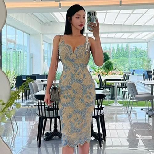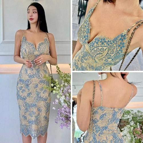 キャバ ドレス キャバドレス ワンピース ミディアムドレス キャミワンピ エレガント キャミ クラシカル シルエット ストラップ タイト ハート メリハリ 華奢 ドレッシー レース アイラッシュレース 優しい ブルー S M L XL