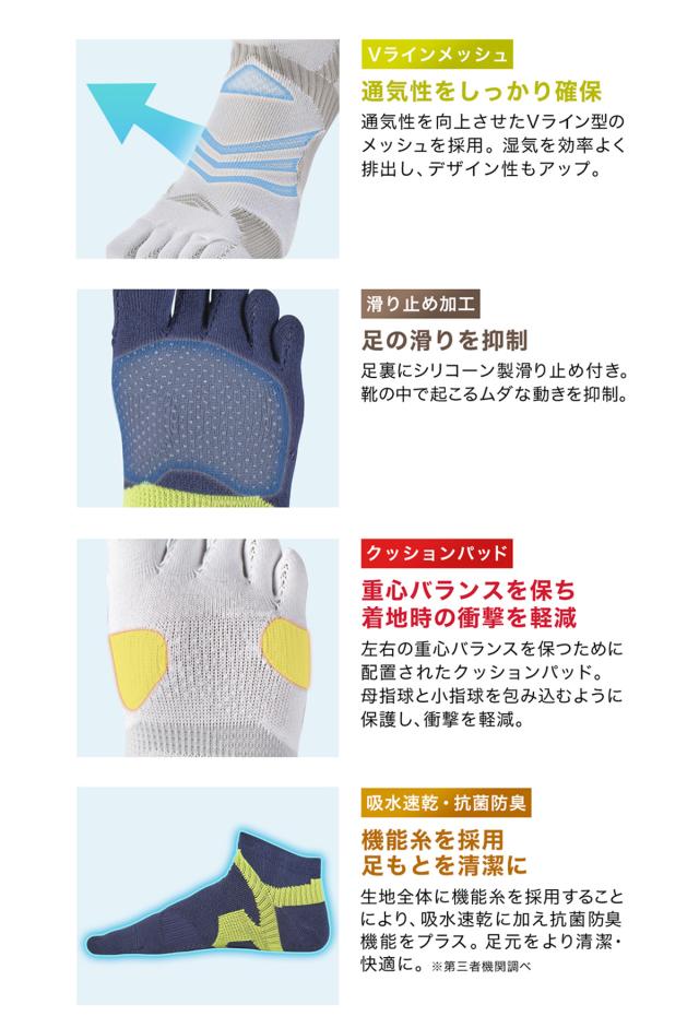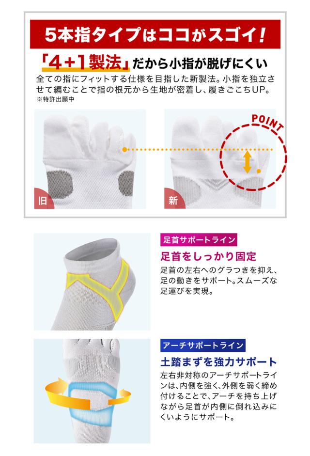 足の各部位に生じる様々なトラブルに対処するために素材や縫製にとことんこだわりました。カラーリングも鮮やかで、スポーツウエアとの相性も◎です!