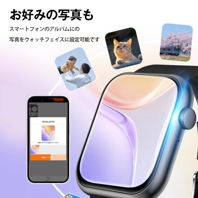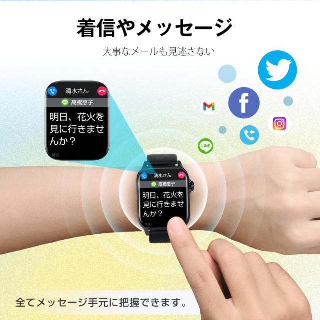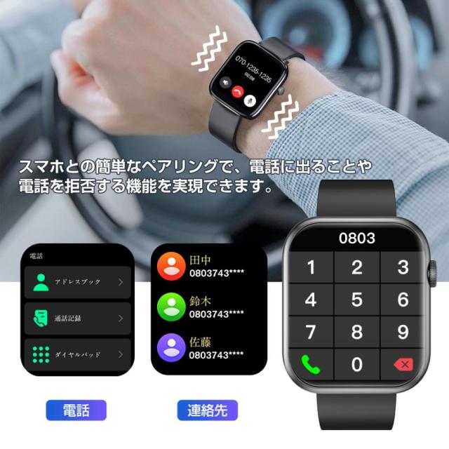 スピーカー&高性能マイクが内蔵され、携帯電話を出さなくても、通話することができます。携帯電話に着信が来た時に、スマートウォッチは振動しながら音でお知らせします。スマートウォッチの画面に相手の名前または電話番号が表示します。着信に応答または拒否することができます。更に電話をかけたり、通話履歴を表示したりすることができます。