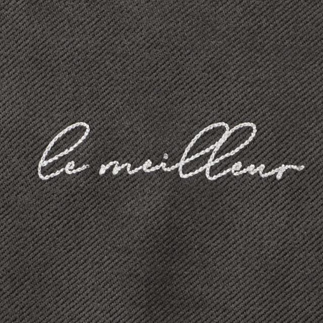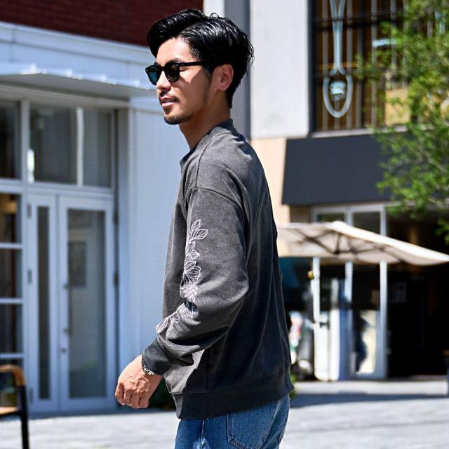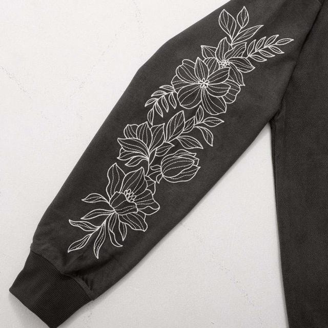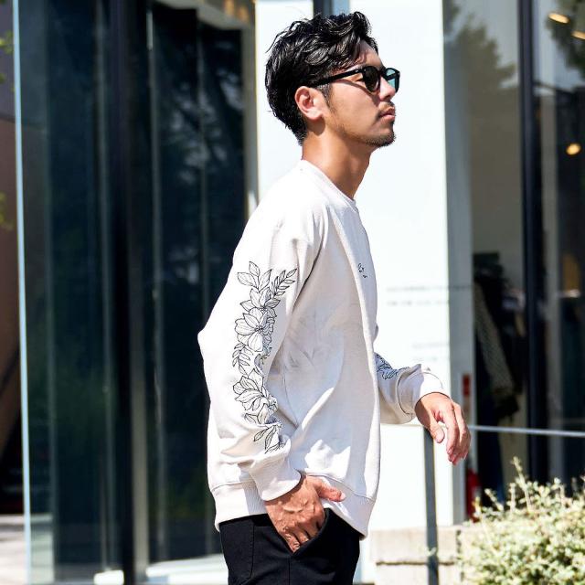 フロントにはシンプルなロゴを配置しつつ、袖には目を引く花柄刺繍を大胆にオン。