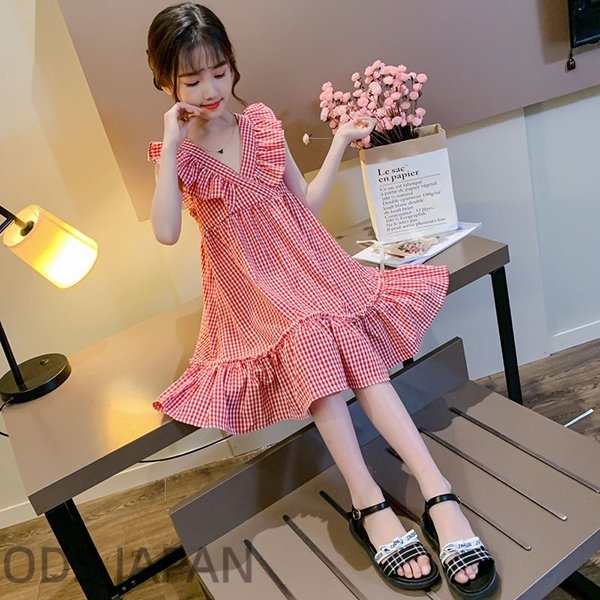 ワンピース キッズ 子供服 女の子 夏 キッズワンピース Vネック チェック柄 フリル 子供ドレス ジュニア お姫様 おしゃれ 可愛い カジュアル 新品 150cm 160cm
