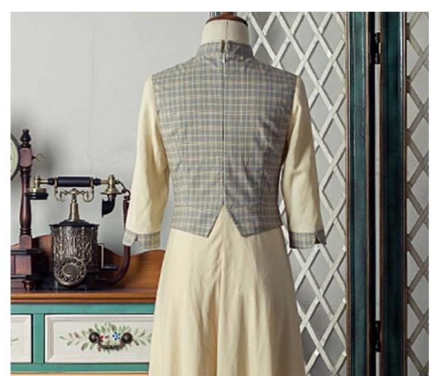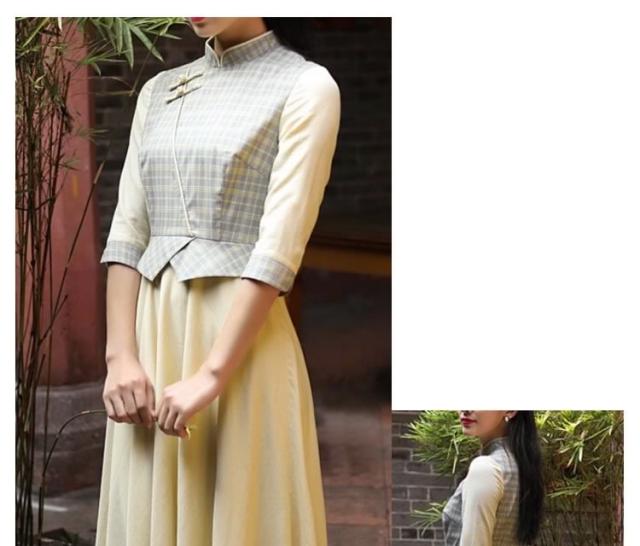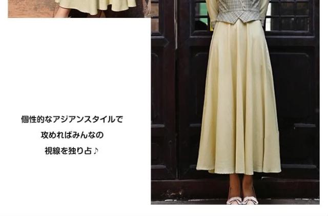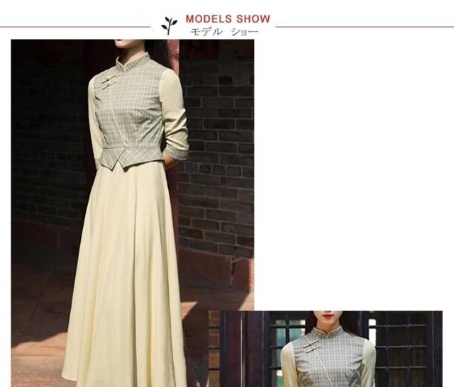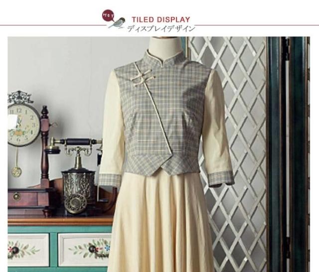 ヴィンテージ風ワンピース ロング レイヤード風ワンピース 中国風ワンピース チェック柄ワンピース バイカラーワンピース フレアワンピース
