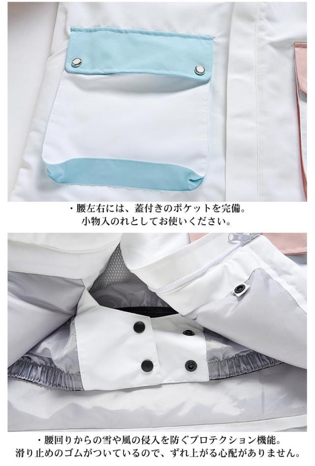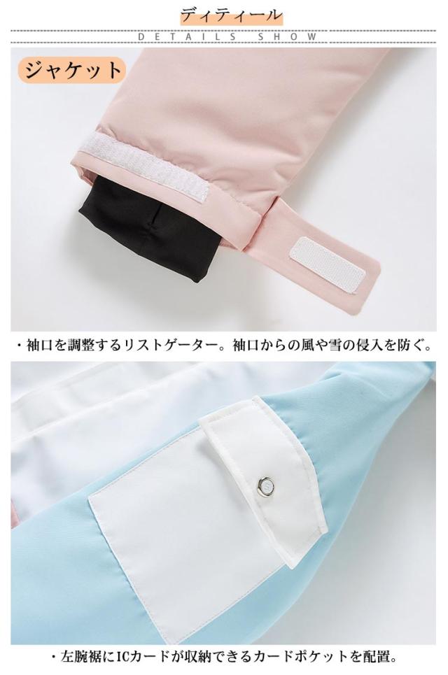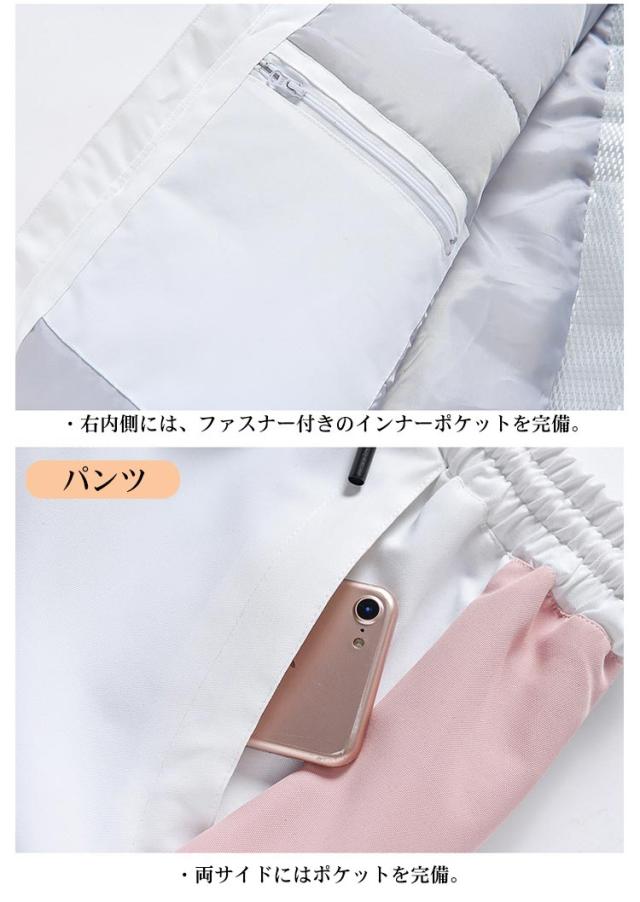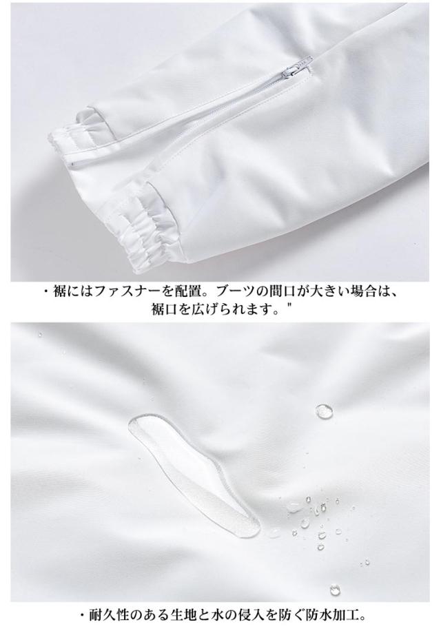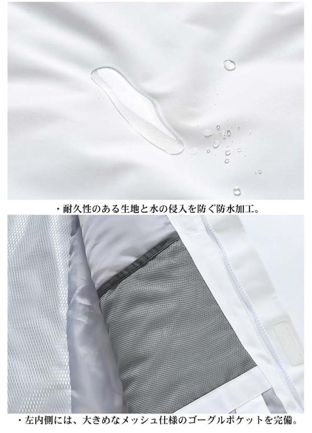 | ジャケット ・袖口を調整するリストゲーター。袖口からの風や雪の侵入を防ぐ。 ・左腕裾にICカードが収納できるカードポケットを配置。 ・腰左右には、蓋付きのポケットを完備。小物入のれとしてお使いください。 ・腰回りからの雪や風の侵入を防ぐプロテクション機能。滑り止めのゴムがついているので、ずれ上がる心配がありません。 ・裾の間口を調整できるウエストアジャスターを設置しています。 ・裏地も中綿仕様で保温性が高く快適 ・耐久性のある生地と水の侵入を防ぐ防水加工。 ・左内側には、大きめなメッシュ仕様のゴーグルポケットを完備。 ・右内側には、ファスナー付きのインナーポケットを完備。 パンツ ・両サイドにはポケットを完備。 ・後ろにはファスナー付きのポケットを完備。 ・中綿仕様で保温性が高く快適 ・耐久性のある生地と水の侵入を防ぐ防水加工。 ・裾にはファスナーを配置。ブーツの間口が大きい場合は、裾口を広げられます。 | |