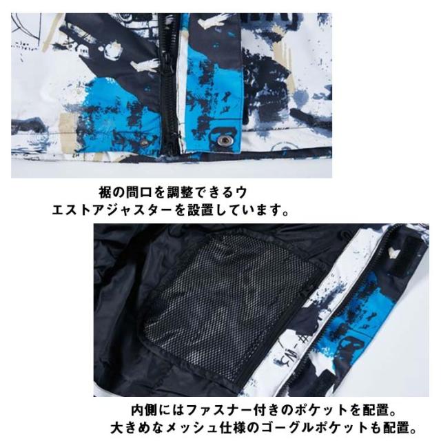 | お洒落さも機能性も妥協しないスノーボードウェア。 高密度生地で防風に優れ、撥水加工も施され、雪遊びに安心。 たっぷり中わた入りで、保温性もバツグン。 ジャケット:袖口を調整するマジックテープ。袖口からの風や雪の侵入を防ぐ。 脇の下にファスナーが付いているのでウェアを着たまま体温調節ができます。 取り外しができるフード。 左腕裾にカードが収納できるカードポケットを配置。 両サイドには、ファスナー付きのポケットを完備。小物入のれとしてお使いください。 裾の間口を調整できるウエストアジャスターを設置しています。 裾からの雪や風の侵入を防ぐプロテクション機能。 内側にはファスナー付きのポケットを配置。大きめなメッシュ仕様のゴーグルポケットも配置。 水をはじく撥水性も高く、体温が高めの子供の汗を逃がす透湿性も抜群。 パンツ: 取り外しが可能なサスペンダーを配置。ソフトな肌触りのゴム仕様で、肩への負担を軽減します。 両サイドには、ファスナー付きのポケットを配置。 ウエストサイドにはゴム仕様で着心地抜群。 ブーツゲーターを配置。ブーツの上から被せ、足元からの雪や風の侵入をシャットダウン。強い滑り止めのゴム付きで、ズレ上がりを防止します。 サイズ調整が可能な裾口。裾口を広げられるので、ブーツにかぶせる際も楽に脱着が可能です。 耐久性のある生地と水の侵入を防ぐ防水加工。 | |