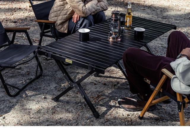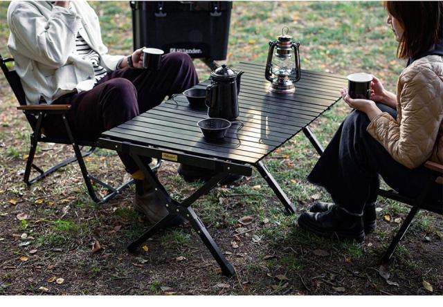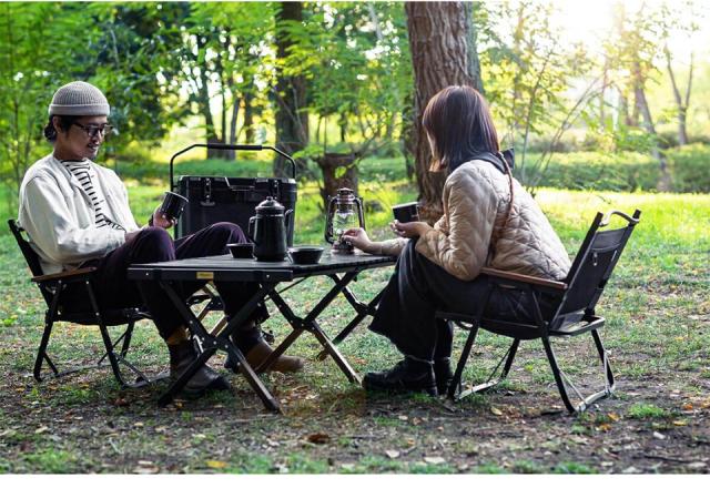 異素材との相性がいいブラックはキャンプテーブルとしても優秀。シンプルなデザインのため空間に圧迫感を与えず、シックに決まります(※画像は120サイズを使用しております)。