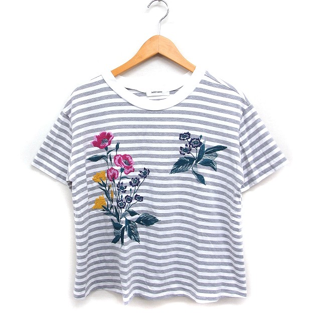【中古】スーパーハッカ SUPER HAKKA ボーダープリント 花柄刺繍 Tシャツ カットソー 半袖 丸首 コットン 綿 グレー