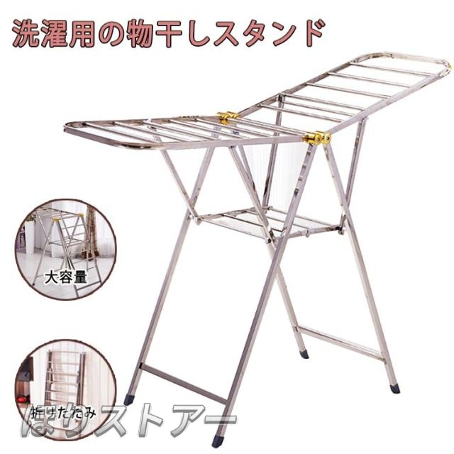 | 洗濯用の物干しスタンド ステンレス製だから環境にも優しく、錆にも強い!長く愛用していただけるアイテムです♪ コンパクト&軽量設計の為、狭いベランダやバルコニーで是非使っていただきたいです。 もちろんお部屋んでの仕様もOK! 使わないときはコンパクトに収納できるので、お部屋の隅に置いていても気になりません。 上段にはタオルやバスタオルを掛ける事ができ、下段には靴などを置けます。 一人暮らしの方から補助用としてお使いいただいてる方が多いです | |
