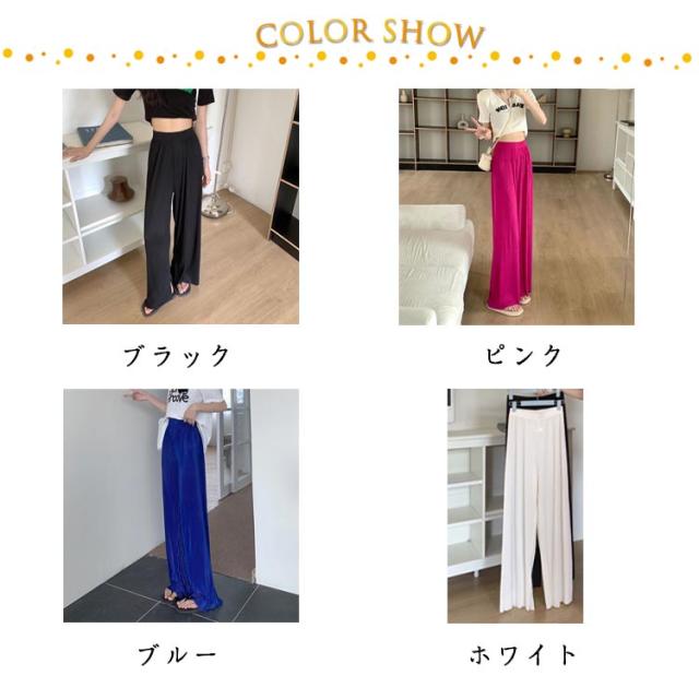 切れるパンツ プリーツパンツ ウェストゴム ボトムス ガウチョパンツ ロング丈 ワイドパンツ イージーパンツ パンツ プリーツリブパンツ プリーツ 縦ライン セルフカット 裾カットOK 高見え ブラック ピンク ブルー
