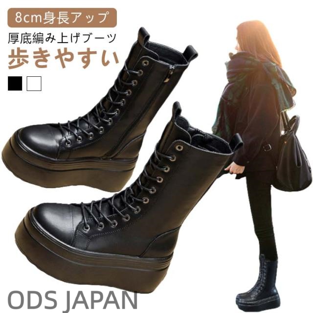 | 8cm身長アップ!歩きやすい厚底編み上げブーツ。 内側にファスナー付きでサッとはけて、気軽におでかけ。 厚底なのに軽いから長く歩けて疲れにくい! 少しの汚れならサッと拭けばキレイになって、お手入れらくちん! マニッシュなパンツスタイルはもちろん、スカートやワンピースの可愛い系コーデにも良く合います! | |